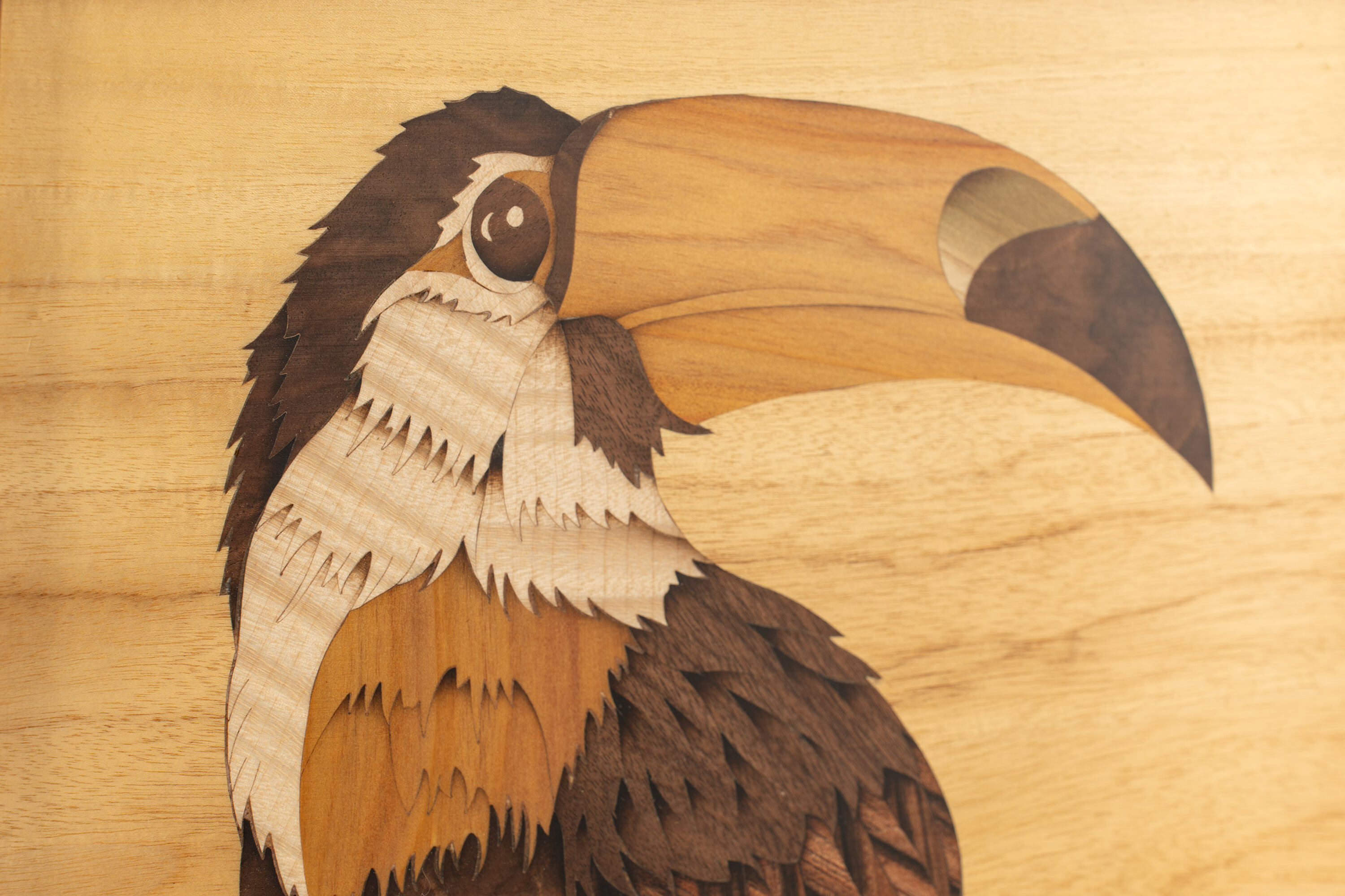 捕捉大嘴鳥自在飛翔的瞬間,以木紋呈現自然生態之美,象徵勇於嘗試與自由精神。