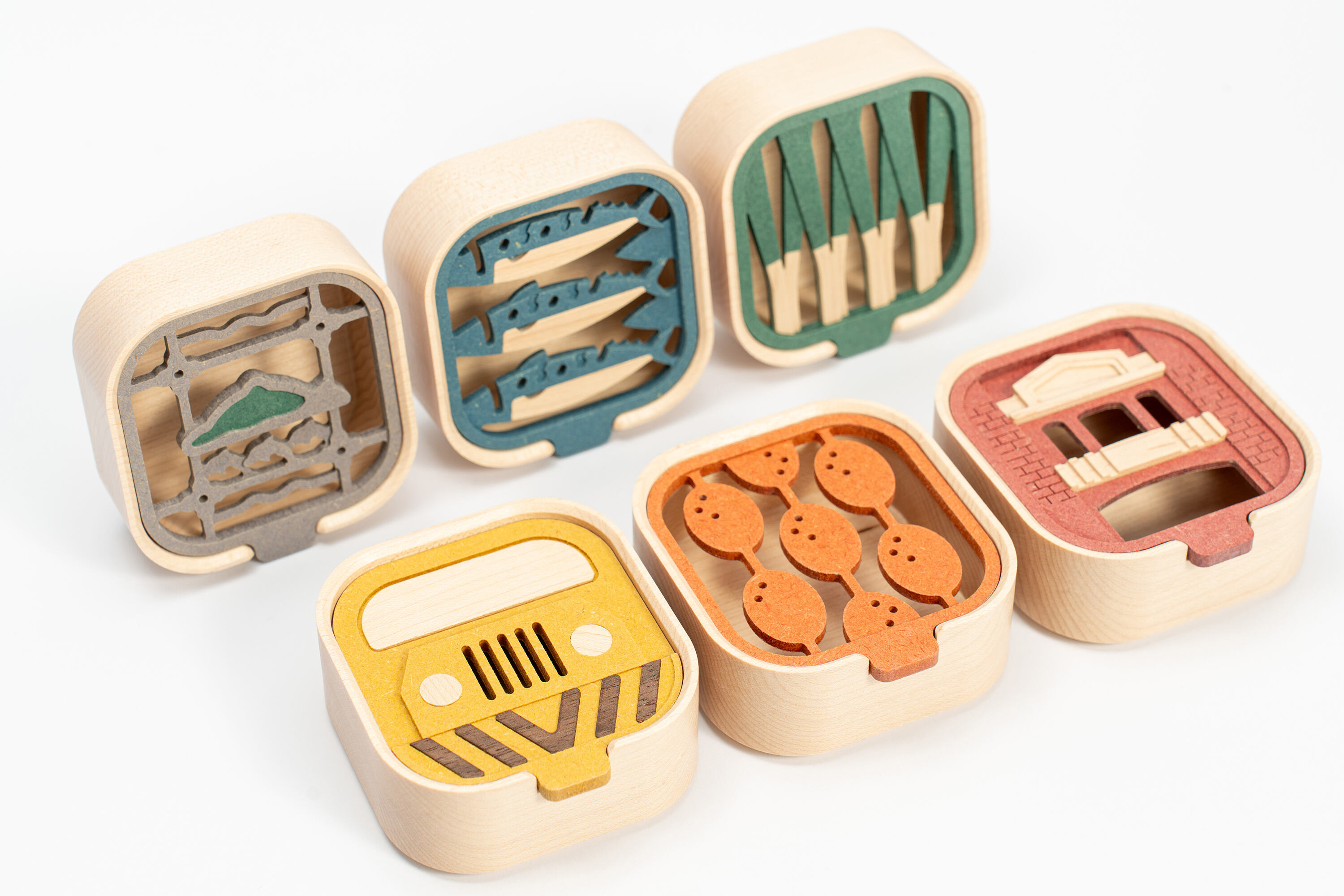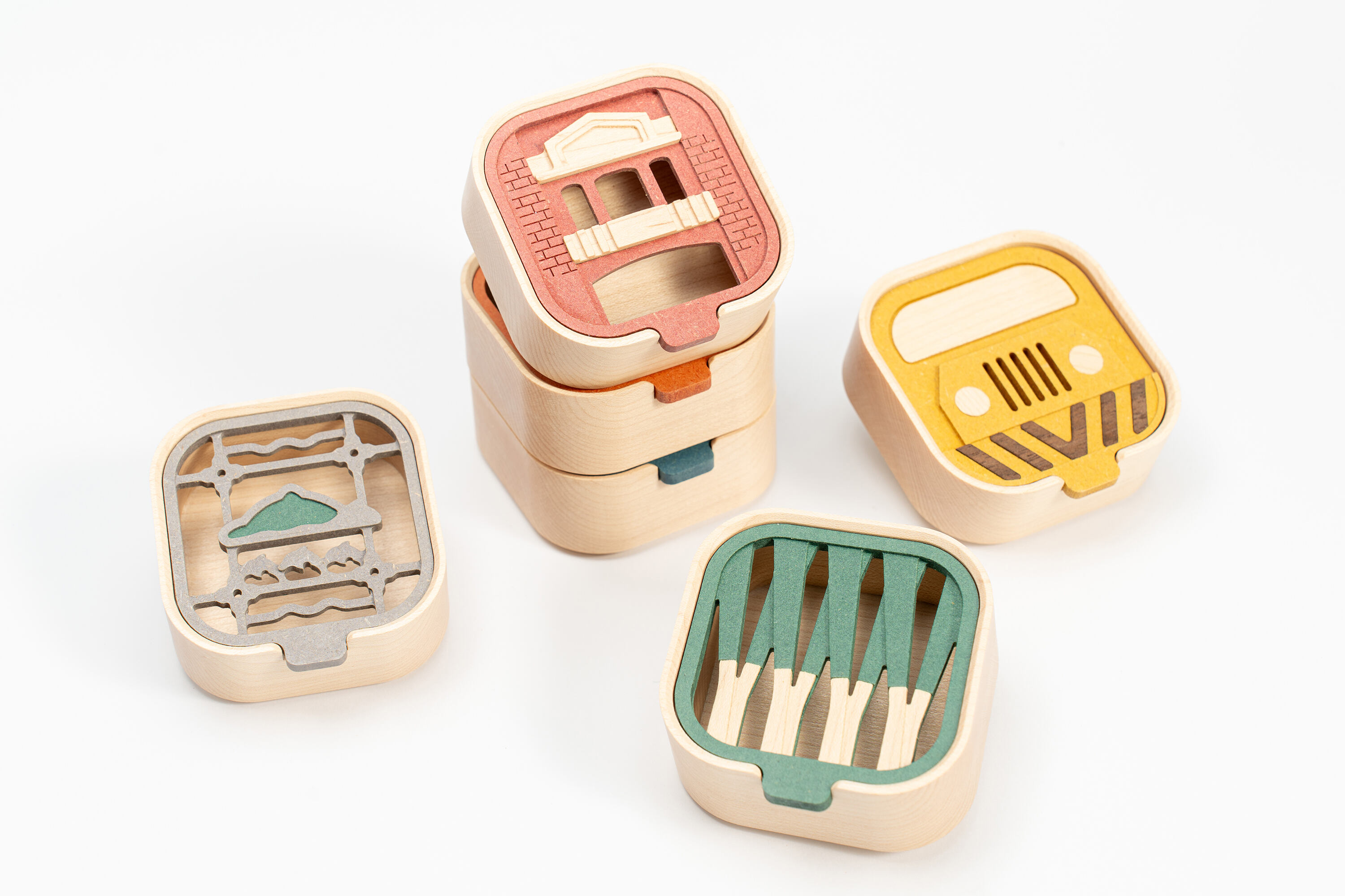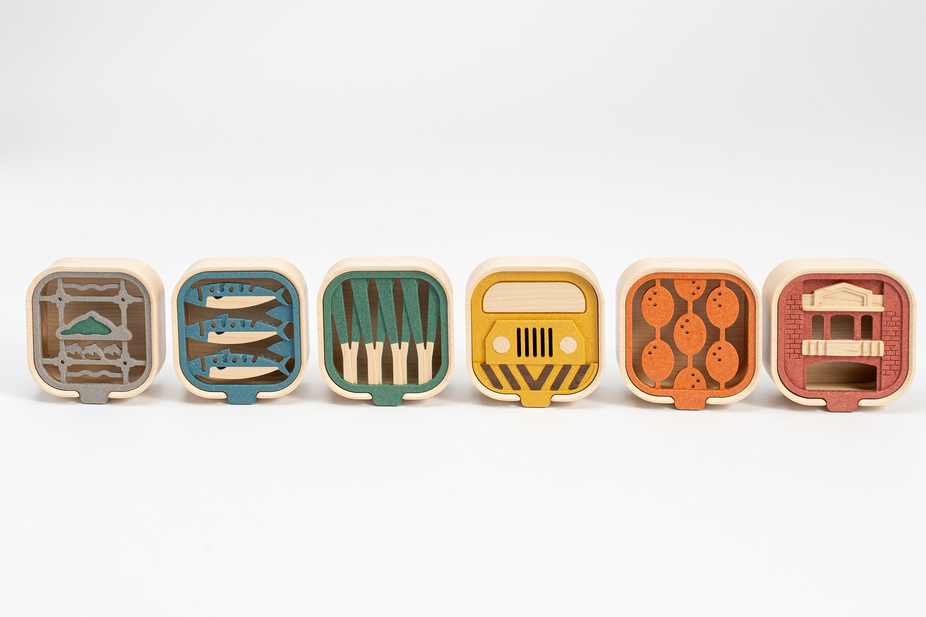 將六種宜蘭特色元素轉化為不同色彩與造型的收納盒蓋面設計,透過幾何化與象徵化的圖形語彙,使地方意象以現代簡約的方式呈現。色彩呼應主題,例如綠色表現三星蔥、藍色象徵鯖魚與海洋、橘色呼應金棗等,增添辨識度與趣味性。異材質層疊的立體效果不僅提升視覺層次,也使每一款蓋子都像一幅微縮的地方故事畫面,讓使用者在收納與取物間與宜蘭的文化產生情感連結。